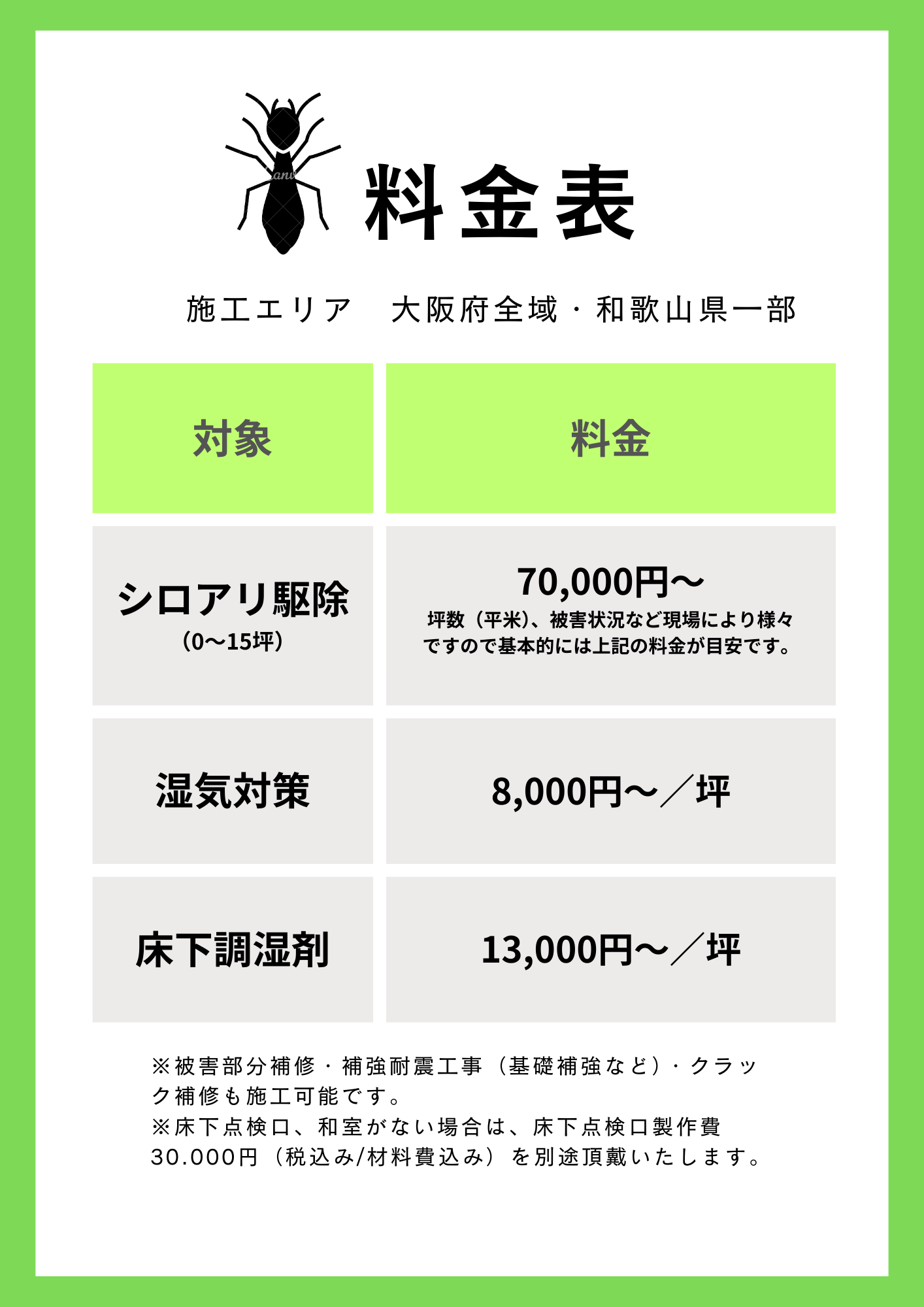 しろあり防除施工士は、必要な知識を有し、防除施工標準仕様書に沿って安全かつ確実な防除施工を行うことを証明するものです。それを取得している代表の山中が点検からお見積り、施工までワンストップで対応させて頂きます。シロアリ・腐朽・木材・薬剤・建築・防除施工に関する知識からシロアリ防除に関する最新の情報を取り入れています。