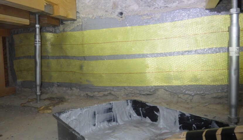 パワーアラストを塗った部分の上にアラミド繊維シートを貼り、基礎にパワーアラストを浸透させていきます。